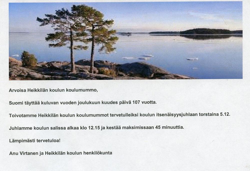 Perinteiseen tapaan koulumummit ja isovanhemmat kutsuttiin kunniavieraiksi Heikkilän koulun itsenäisyyspäiväjuhlaan 5.12. Joka luokalla oli oma esiintyminen, laulua tai lausuntaa, kutosluokkalaiset toimivat airueina. Lasten esiintyminen on heille jännittävää ja yleisölle liikuttavaa.