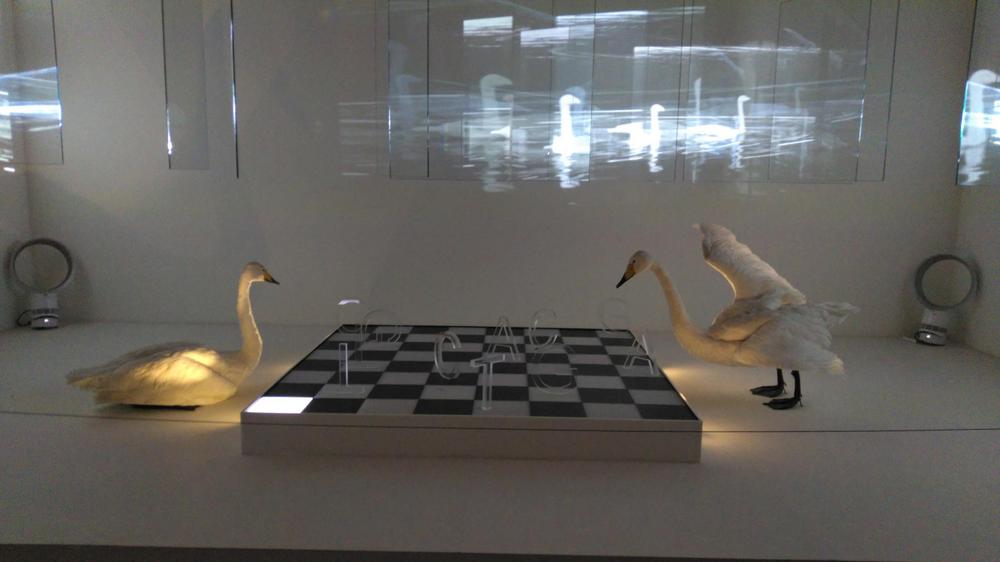 Päänäyttelyn keskellä on puusta rakennettu Sotkanmuna, jonka ytimenä on taiteilija Osmo Rauhalan installaatioteos "Peliteoria"