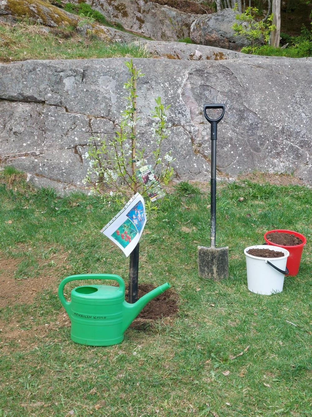 Rehtori etsi sopivan paikan, martit kaivoivat kuopan ja mummmit istuttivat tokaluokkalaisten avustaessa. Oppilaat voivat seurata mitä puussa tapahtuu eri vuodenaikoina. Puu oli istutuspäivänä kukassa ja seuraavan lukukauden alkaessa saattaa olla jo sato valmiina.