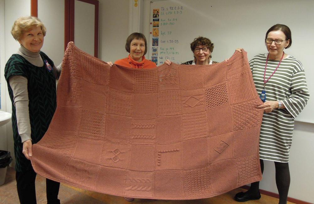 Illan aluksi annettiin Leenalle syntymäpäivälahjaksi neulottu torkkupeitto ja orkidea.