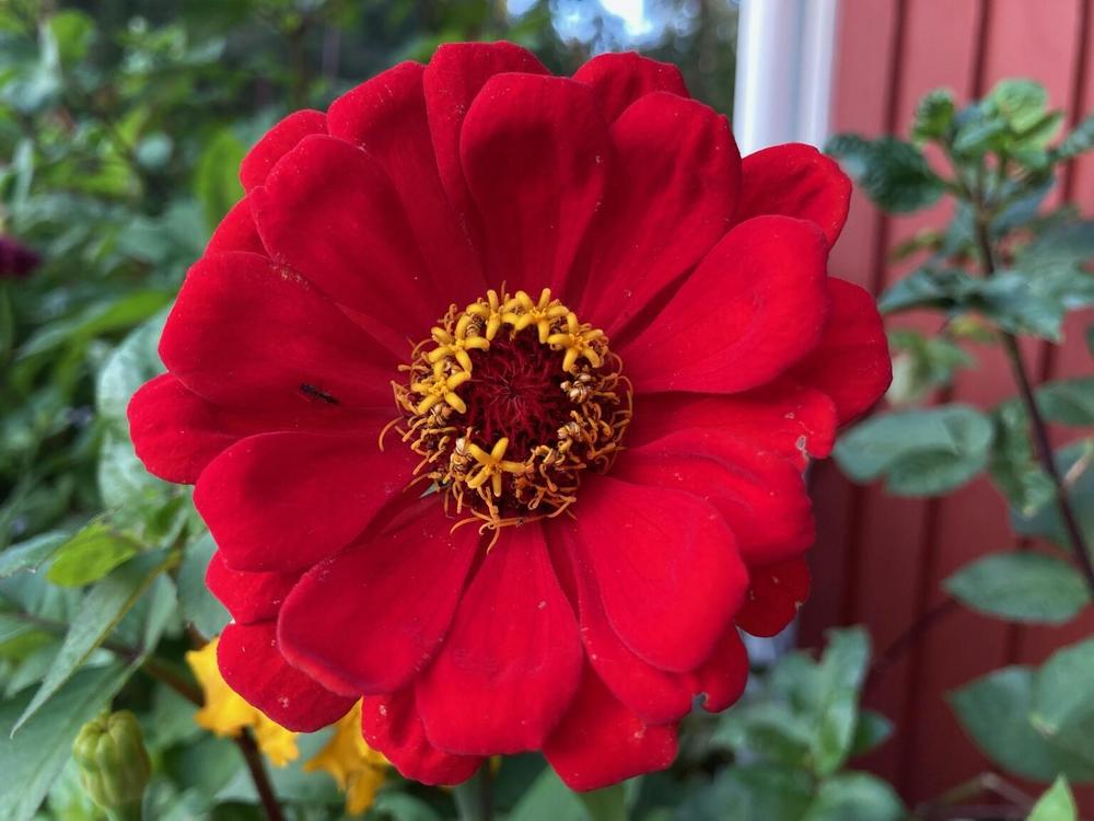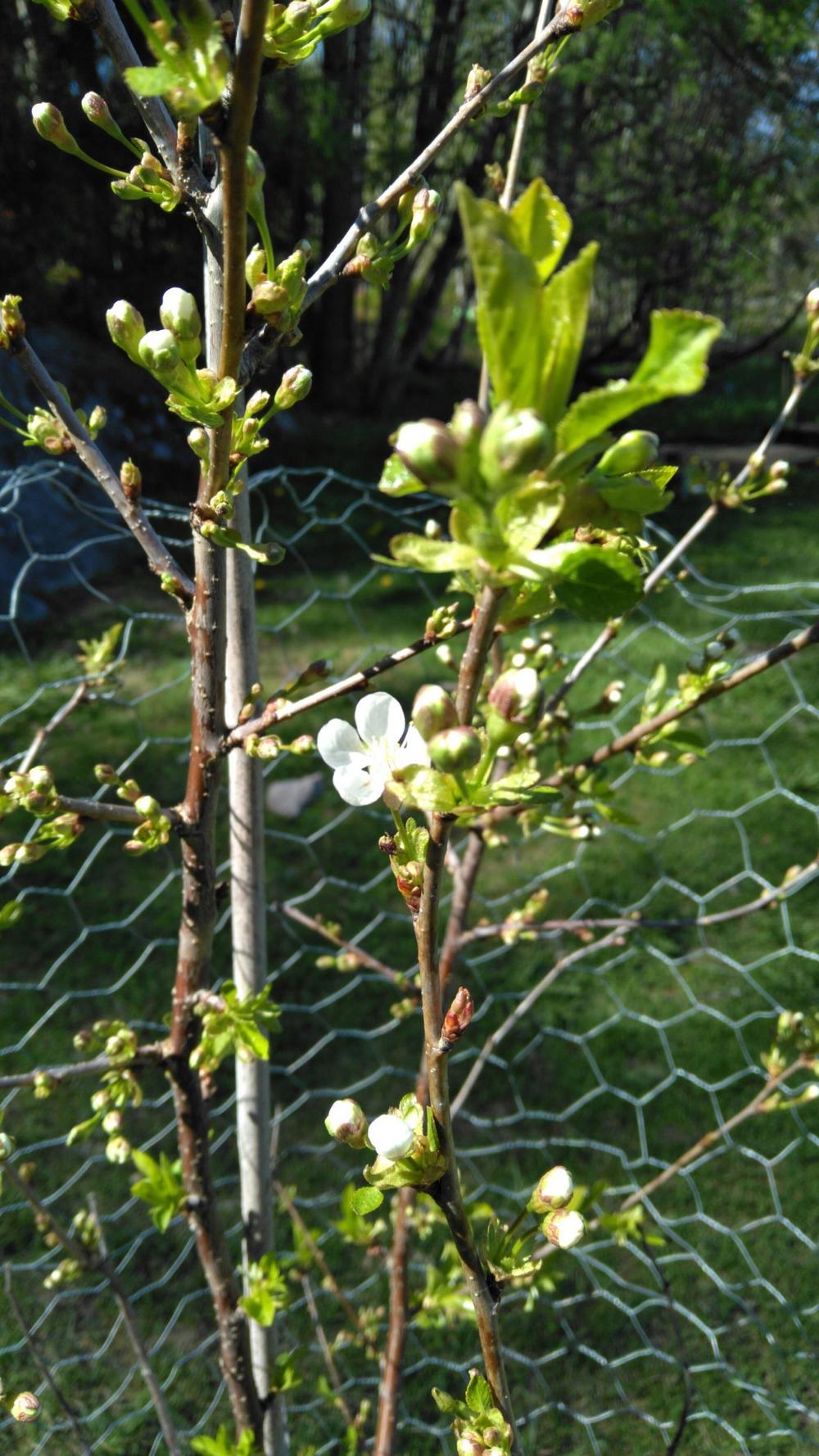 Vuosi sitten istutettu kirsikkapuu Heikkilän pikkukoulun päätyyn oli selvinnyt hyvin talven yli. Ehkäpä satoa saadaan syksyllä.