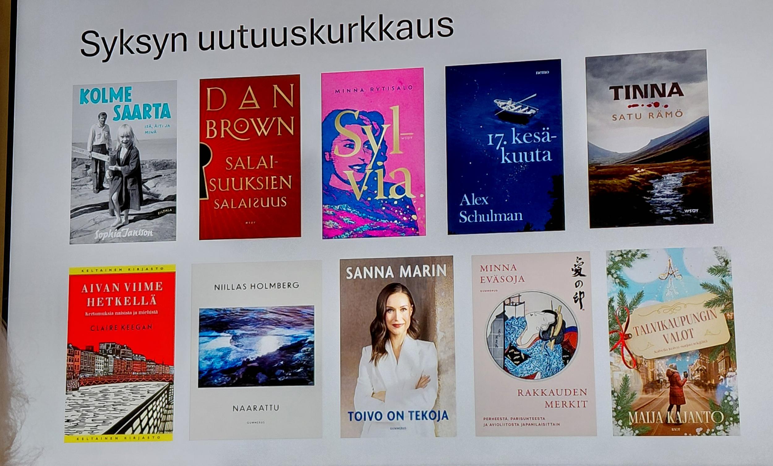 Toisessa kuvassa syksyn uutuuskirjoja.