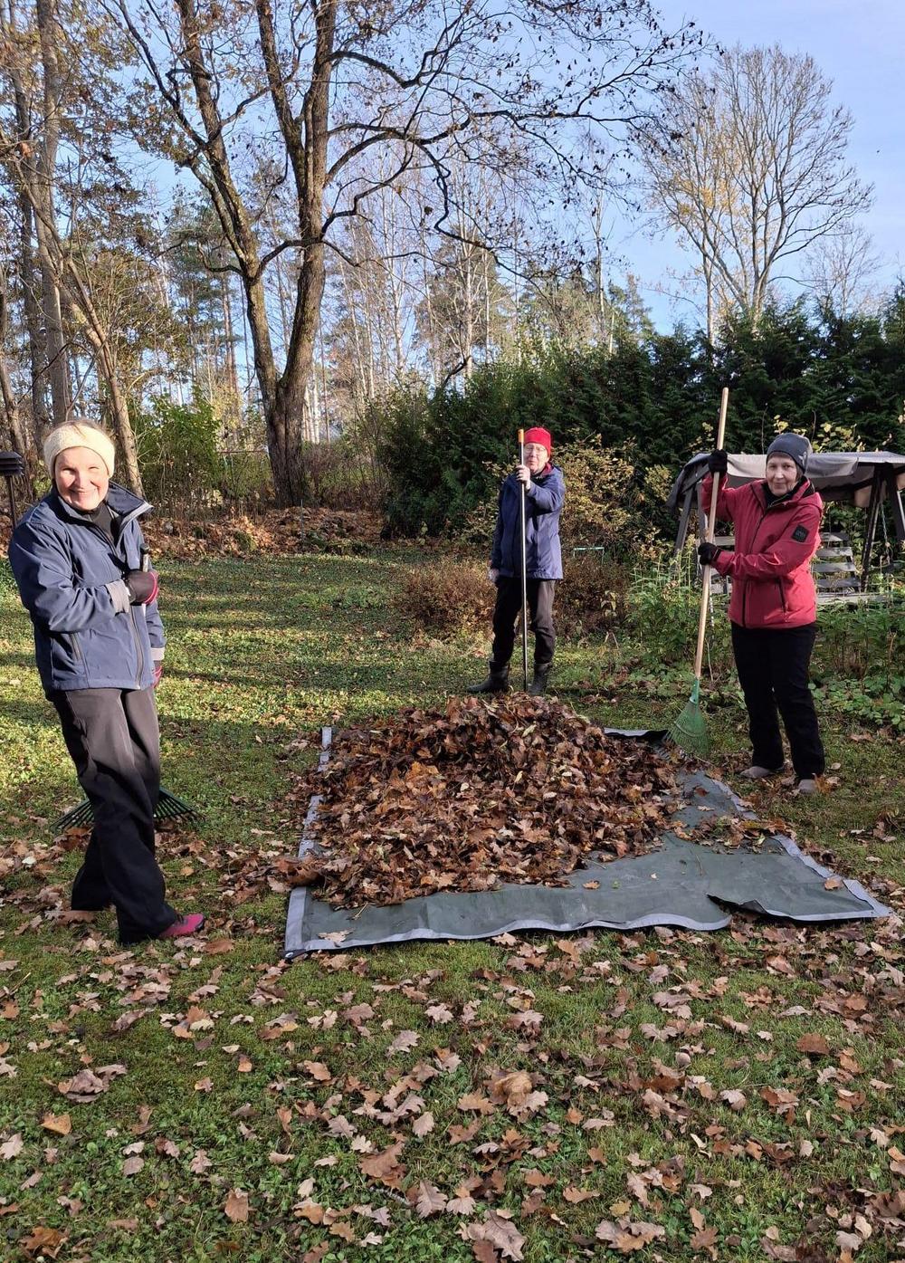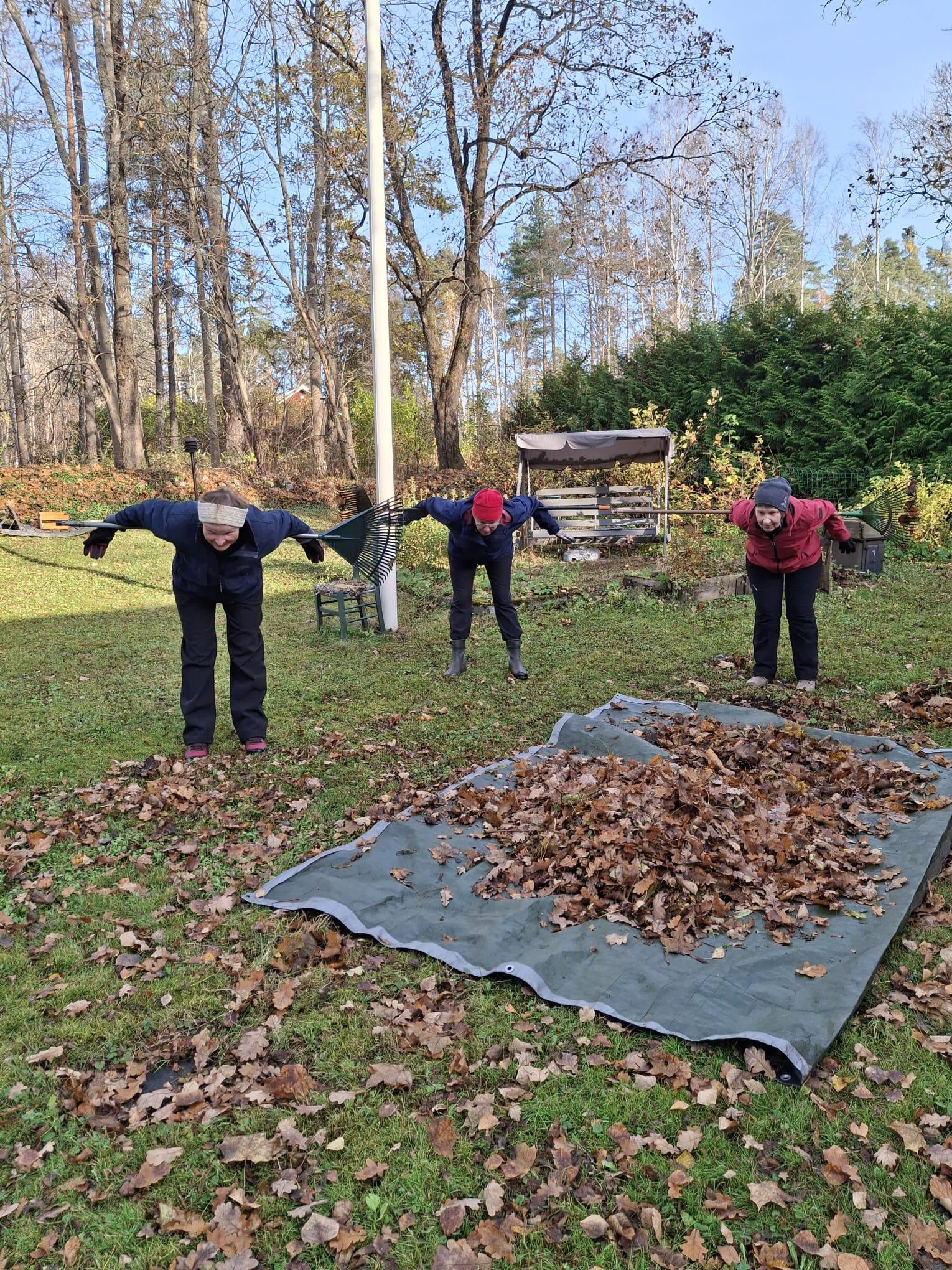 Lokakuinen perinne pienellä marttaporukalla: Haravointitalkoot marttaystävän pihalla, kiitoksena lihakeittoa, jälkiruokakahvit ja omenapiirakkaa. Sää suosi, aurinko paistoi ja kuivia lehtiä oli helppo haravoida.