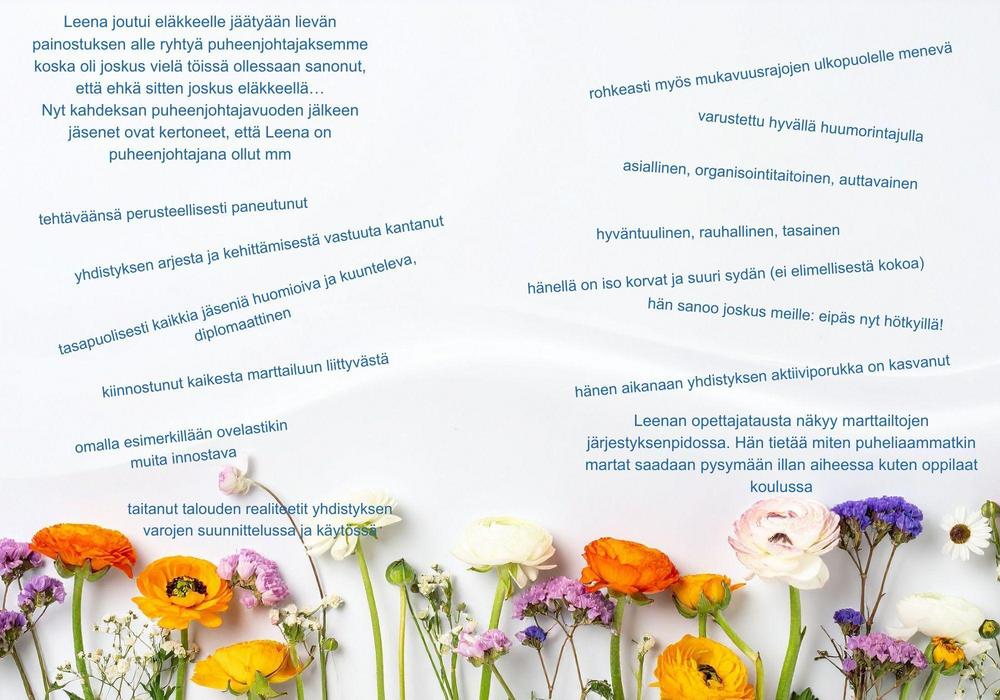 Jäseniltä kysyttiin kommentit heidän kokemuksistaan Leenasta puheenjohtajana ja niistä laadittiin kiitoskortti.